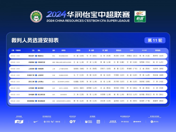 5月10日消息 今日足协官网公布了中超联赛第11轮裁判安排,其中马宁执法上海申花vs天津津门虎,傅明执法青岛西海岸vs深圳新鹏城。